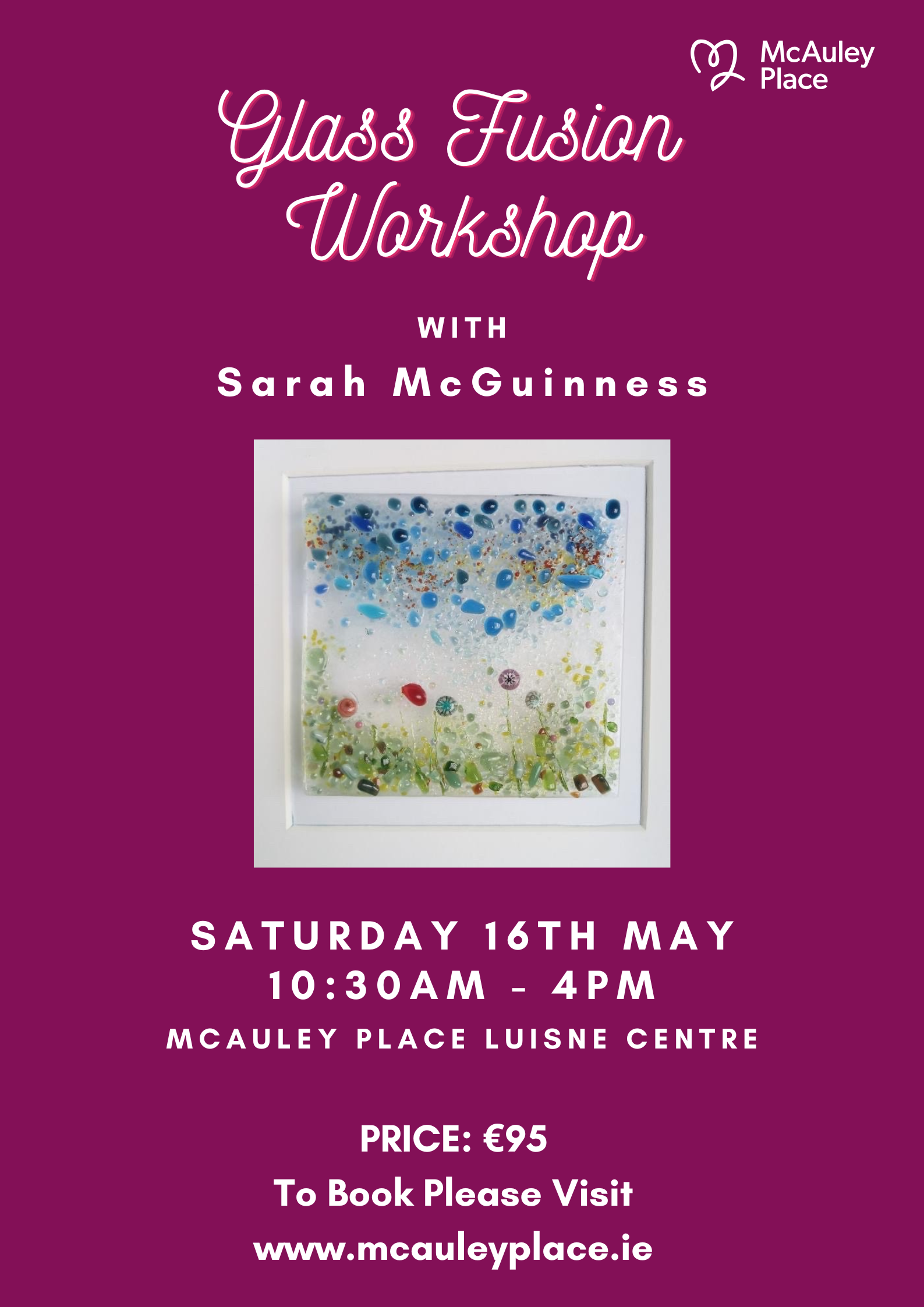 Join Glass Fusion expert Sarah McGuinness for a one day workshop on Saturday 16th May at 10:30am at which you'll create your very own bespoke piece of glass art in a fun relaxed atmosphere